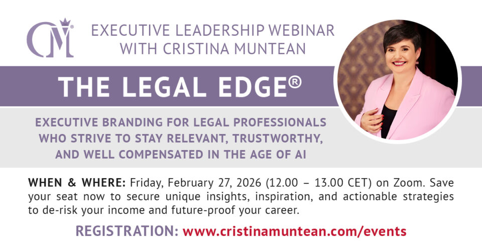 Do you have questions about my upcoming executive leadership webinar THE LEGAL EDGE® – EXECUTIVE BRANDING FOR LEGAL PROFESSIONALS IN THE AGE OF AI? Please send them my way via WhatsApp at +420 776 574 925 or via email at Cristina.muntean@vornica.com.